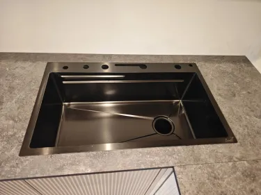 Подгоним под размер, сделаем выпилы под коммуникации и установим столешницу. Наклеим кромки. Работа займёт 2–4 часа. Будет шумно.